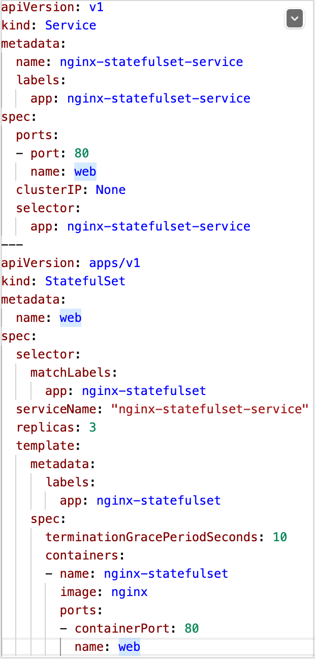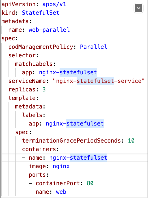 기본 동작은 순서대로 파드를 관리하는 것이지만 spec.podManagementPolicy 필드를 이용해 순서를 없앨 수도 있음.