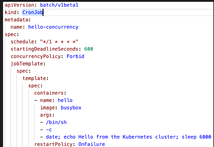 - spec.startingDeadlineSeconds : 지정된 시간에 크론잡이 실행되지 못했을 때 설정한 시간까지 지나면 크론잡이 실행되지 못하게 함