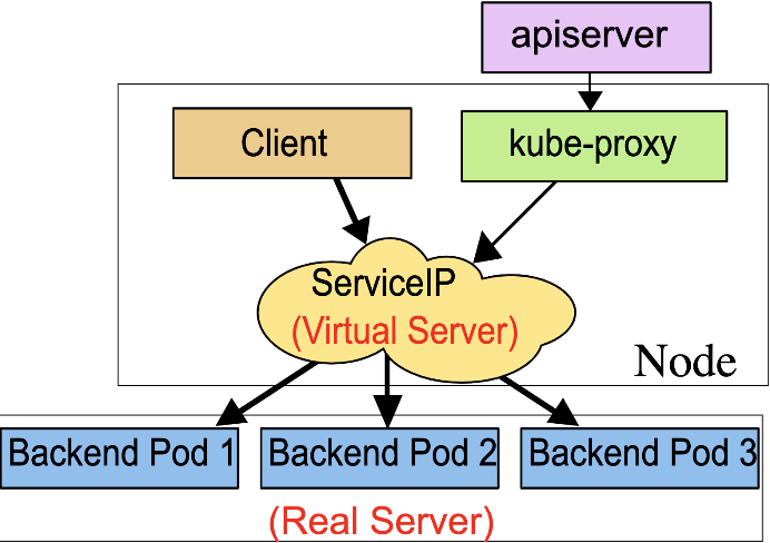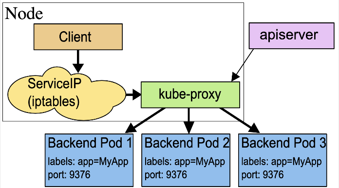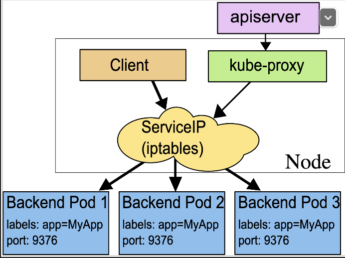 클라이언트에서 서비스의 클러스터 IP를 통해 어떤 요청을 하면 iptables을 거쳐 kube-proxy가 요청을 받음