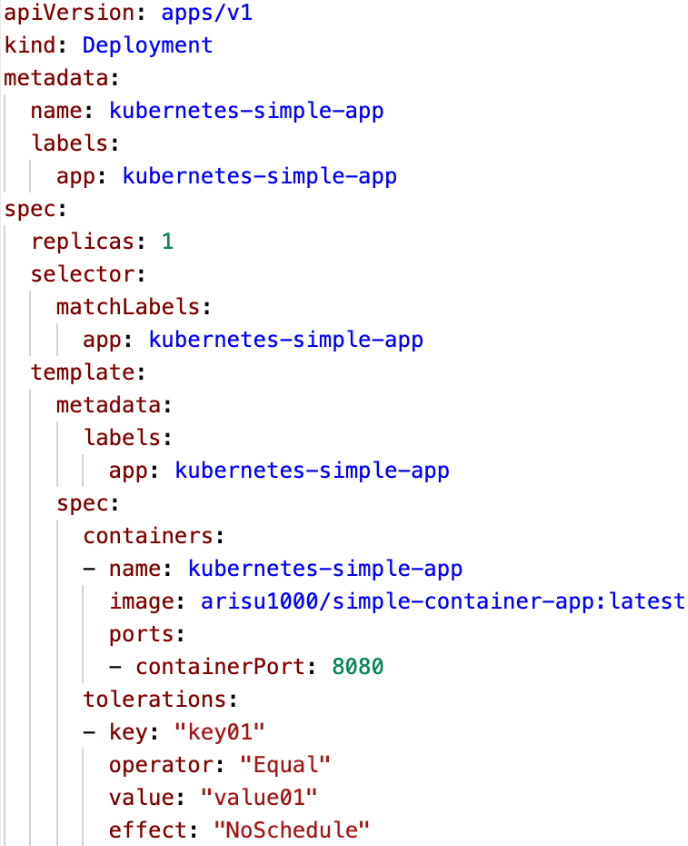 .spec.template.spec.tolerations[] : 테인트가 설정된 노드의 키-값을 적어 배치되도록 함