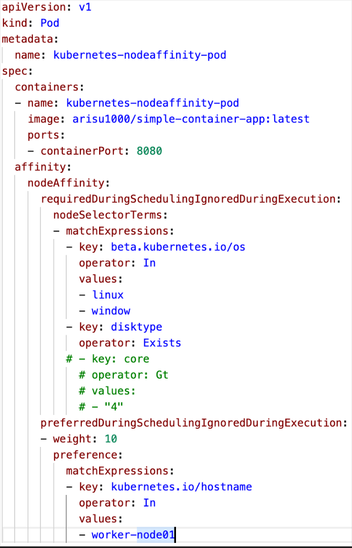 - spec.affinity.nodeAffinity.requiredDuringSchedulingIgnoredDuringExecution : 스케줄링하는 동안 꼭 필요한 조건