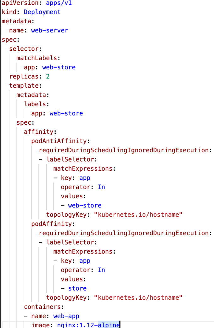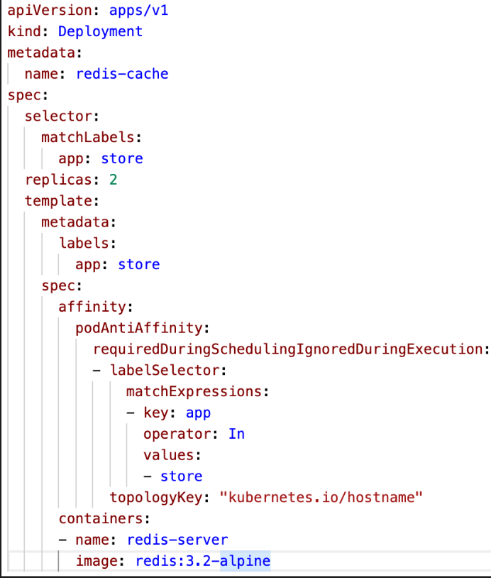 .podAntiAffinity : 해당 레이블 키-값에 해당하는 노드에 배치를 피함 -> 파드 2개이상 같은 노드에 속하지 못함