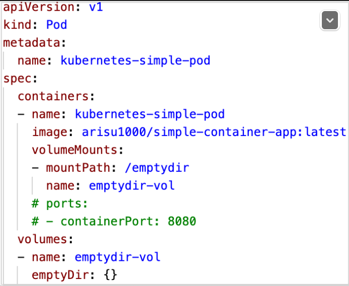 .emptyDir : 빈 값으로 설정 - spec.containers[].volumeMounts[] : 선언했던 볼륨을 컨테이너 설정에서 불러와서 사용 가능
