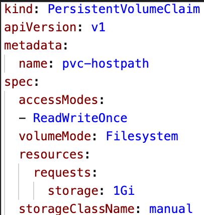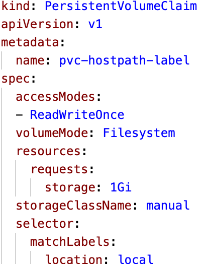 - metadata.labels. : PVC에서 선택할 수 있도록 적절한 레이블 세팅
