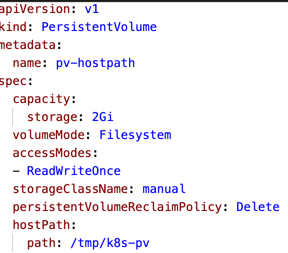- .spec.hostPath : 해당 PV의 볼륨 플러그인 명시