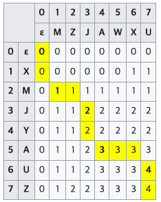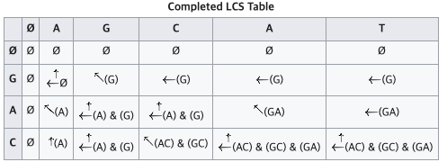 ${\displaystyle LCS\left(X_{i},Y_{j}\right)={\begin{cases}\emptyset &{\mbox{ if }}\ i=0{\mbox{ or }}j=0\\{\textrm {}}LCS\left(X_{i-1},Y_{j-1}\right)+1&{\mbox{ if }}x_{i}=y_{j}\\{\mbox{longest}}\left(LCS\left(X_{i},Y_{j-1}\right),LCS\left(X_{i-1},Y_{j}\right)\right)&{\mbox{ if }}x_{i}\neq y_{j}\\\end{cases}}}$