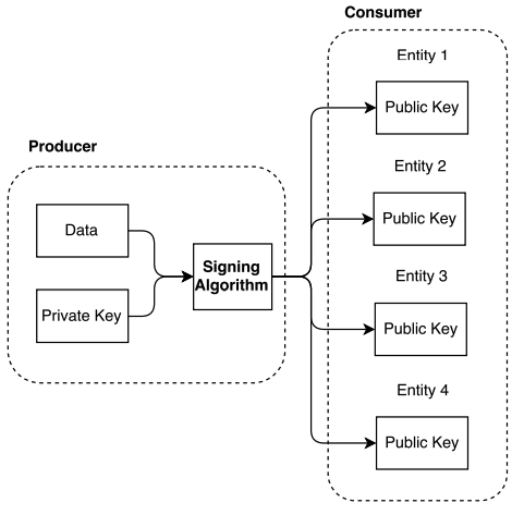 | 서명 | 개인키로 서명, 공개키로 검증 | 검증자: 다수 | Many-to-One |