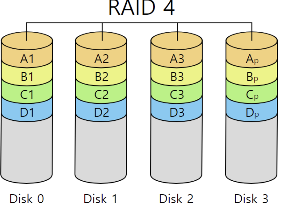 - 별도의 디스크에 패리티 정보 저장
