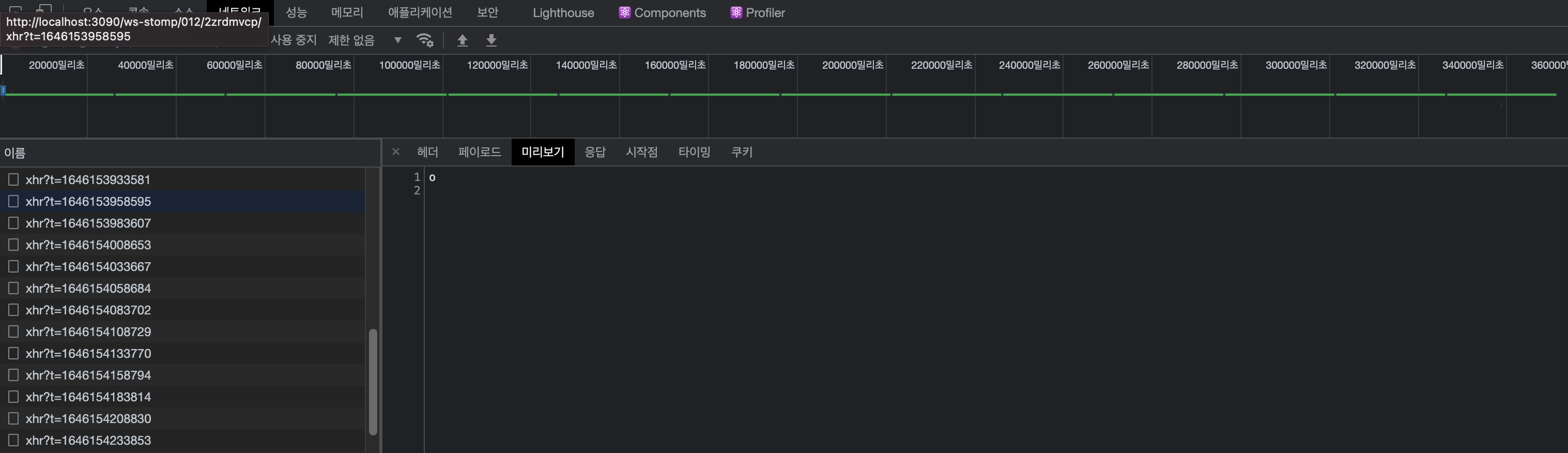- /info 요청 이후 핸드쉐이크가 성공할 경우 커넥션 유지를 위해 xhr?t 의 요청을 계속해서 보냄