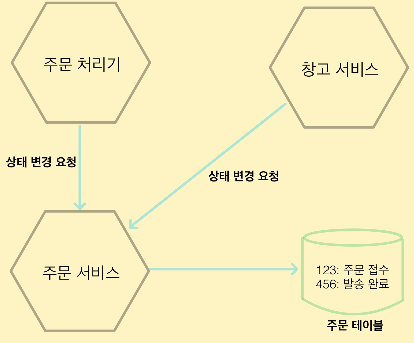 - 창고 서비스나 주문 처리기는 주문 서비스에 상태 업데이트 요청을 보내도록 하기 (유효하지 않은 요청은 거절할 수 있음)