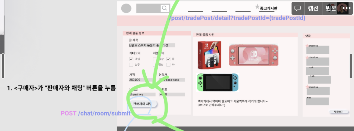 해당 기능에서 채팅을 할 수 있도록 "판매자와 채팅" 버튼을 제공합니다. - 위의 로직과 requestParam 이름만 다를뿐 완전히 동작이 같습니다.